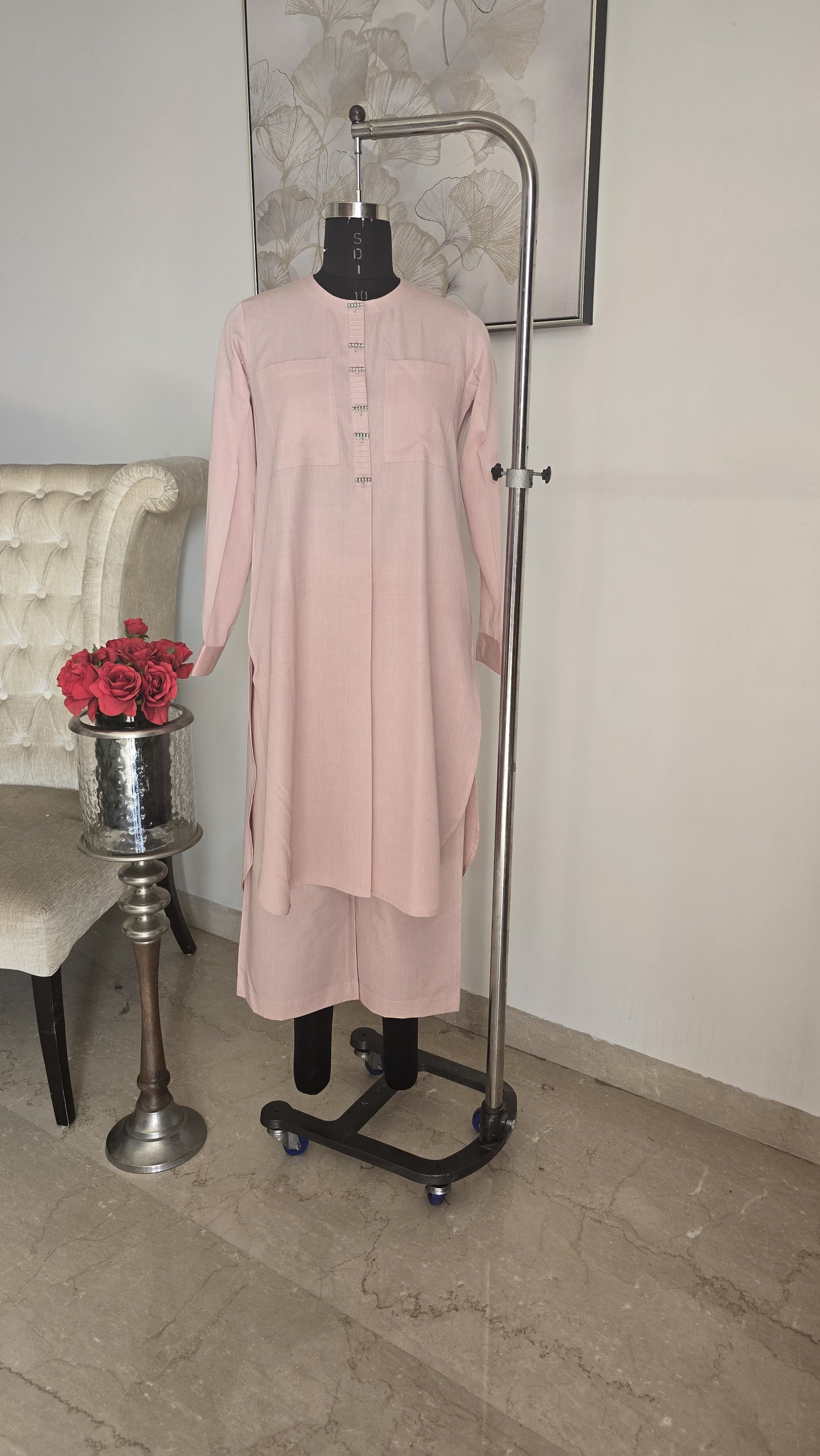 This Pink coord set is made from soft and comfortable Modal fabric, perfect for everyday wear. Its dusky pink color adds a touch of elegance, while the pintucks and metal detailing on the neck make it a stylish and chic addition to your wardrobe. Experience the perfect combination of comfort and style with this Pink coord set.
