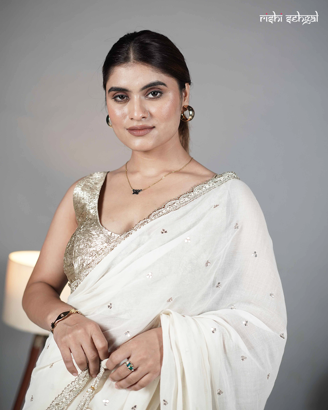 Infused with understated luxury, this rose gold blouse is a perfect blend of elegance and modern minimalism. Crafted from lustrous fabric with intricate texturing, it features a deep neckline and sleeveless silhouette that gracefully enhances the shoulders and collarbones. The padded construction ensures structure and comfort, making it ideal for long festive occasions. Its metallic sheen catches the light beautifully, creating a radiant contrast when paired with ivory or pastel sarees. A timeless statement piece that embodies refined glamour and effortless sophistication.