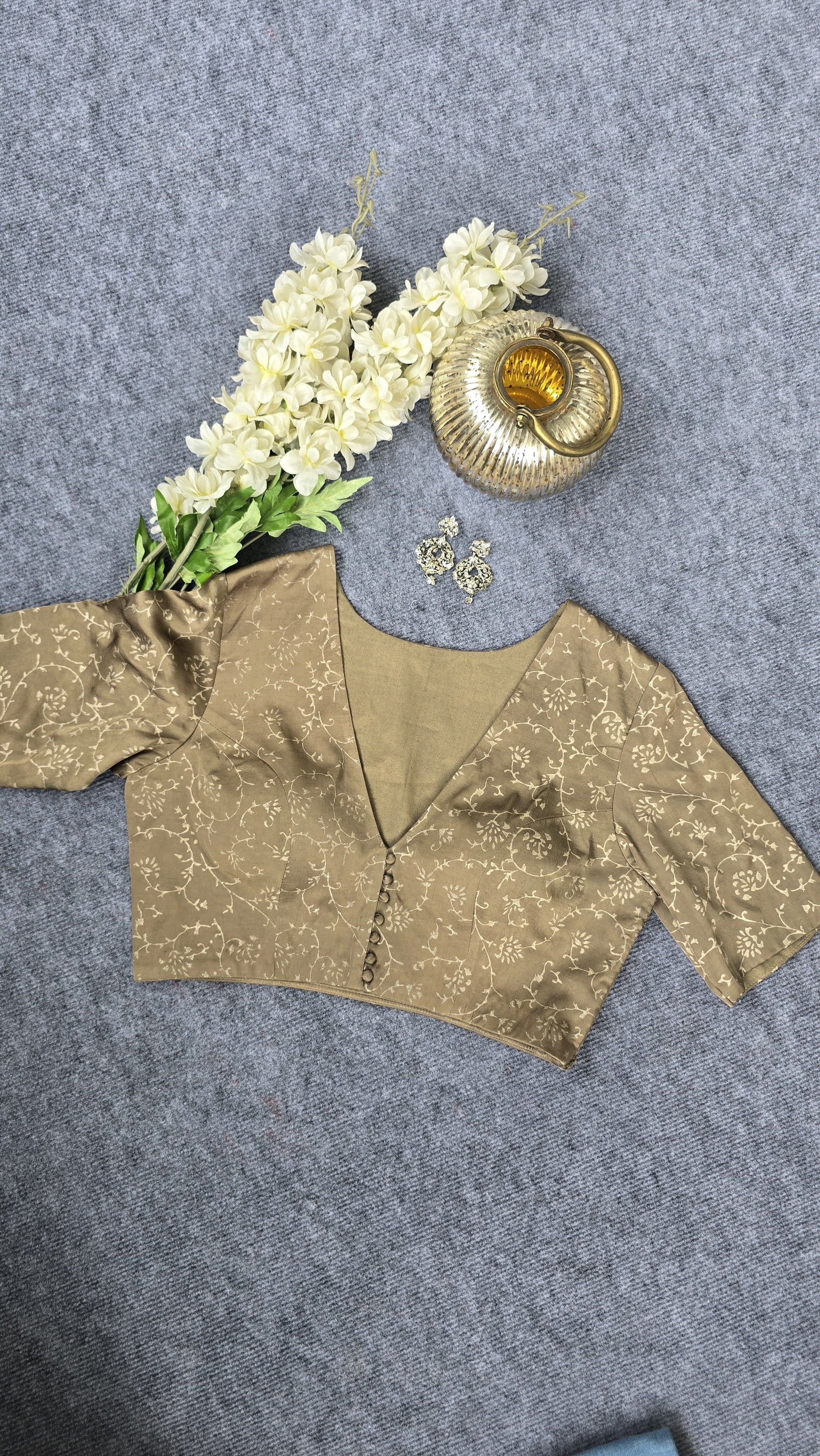 This soft muted olive green blouse is crafted from luxurious modal satin, offering a smooth and comfortable feel. Featuring delicate hand block printing, it showcases artisanal craftsmanship. The blouse is padded for added structure and support, with a convenient front open design that enhances ease of wear and styling versatility. Ideal for those seeking a blend of elegance and comfort in their wardrobe.